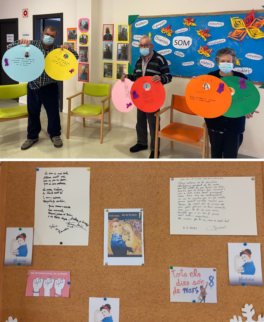 A Olost, la commemoració del Dia de la Dona ha decorat l'espai amb un plafó on s'han inclòs diverses imatges reivindicatives i reflexions de persones usuàries sobre el rol i els sentiments de les dones.