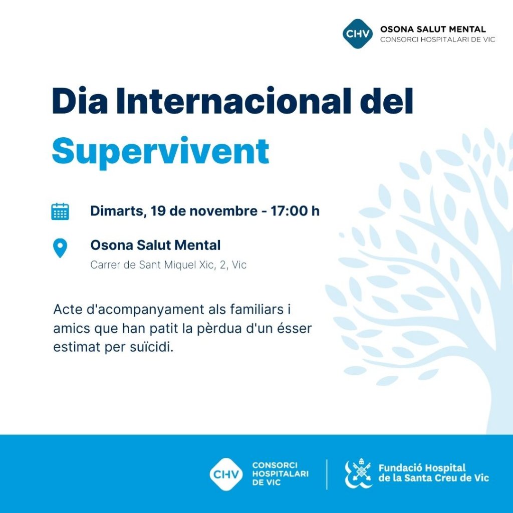 El proper dimarts 19 de novembre, a les 17 h, a l'exterior de l'edifici d'Osona Salut Mental realitzarem un acte en commemoració del Dia Internacional del Supervivent.